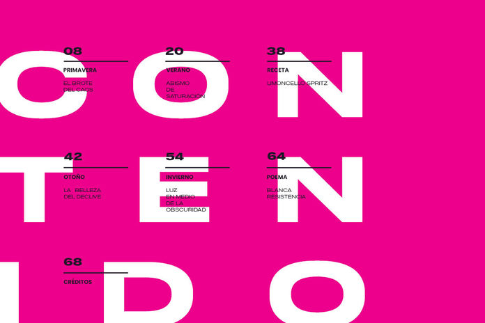 SZNS ( "SEASONS" ) es una revista para sentir las estaciones desde otro lugar. Proyecto editorial dividido en cuatro partes, cada una inspirada en una estación del año: Primavera, Verano, Otoño e Invierno. Lejos de abordar lo estacional desde una mirada tradicional, esta revista explora temas poco convencionales ligados a los ciclos del año, utilizando lo estacional como punto de partida para hablar de lo emocional, lo social y lo sensorial. Desde la saturación y el caos que impone el verano hasta la melancolía introspectiva del invierno.